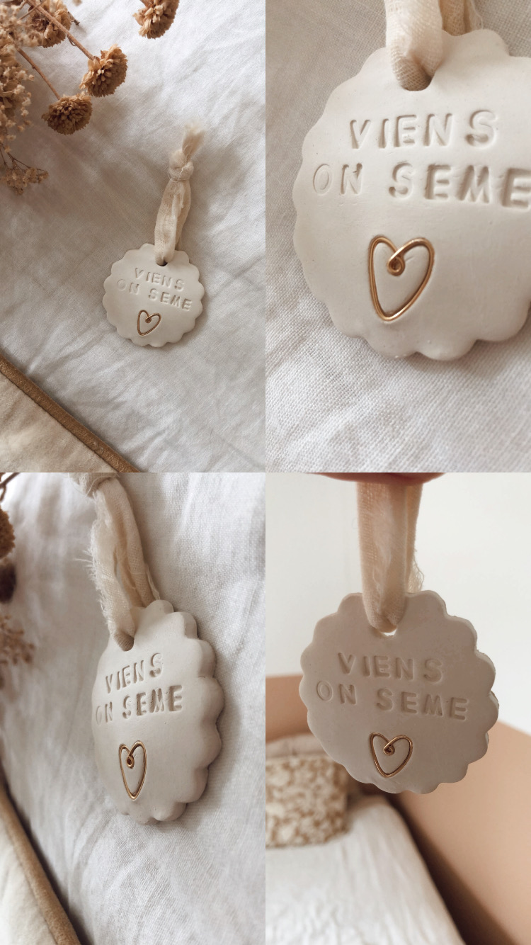 Façonné entièrement à la main grâce à un moule festonné ; un petit cœur et filaire doré fin créé quant à lui à la main, propre à l’univers d’Au rêve éveillé est ajouté. Et quelques lettres déposées avec minutie pour un message empli de poésie.